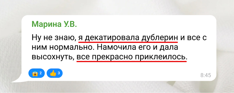 Даже если сегодня он приклеился ровно, нет никакой гарантии, что он не «сядет» при первой же стирке или влажно-тепловой обработке.